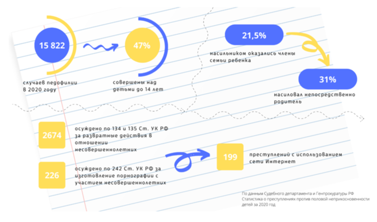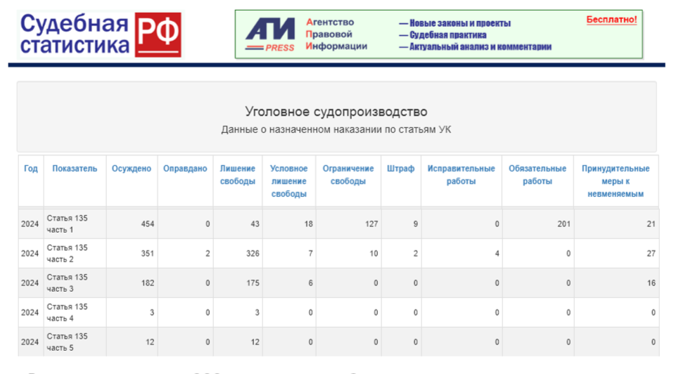 Примечание: если потерпевший (потерпевшая) по возрасту, в силу малолетства, не понимал (а) характер совершенных с ними деяний, преступников судят по статье 131 (изнасилование) или 132 – насильственные действия сексуального характера. Такой статистики нет.
