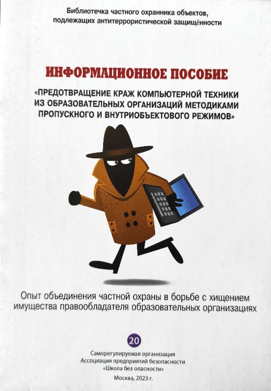 Много времени затрачено было на установление всех способов и особого режима для предотвращения преступлений, связанных с хищением имущества образовательных организаций. Научно-методической группой были выбраны во всех субъектах Российской Федерации 100 (сто) уголовных дел по хищениям компьютерной техники. Компьютеры и другая сопутствующая электронная техника, за последние 20 лет стали основным видом преступных посягательств в сфере «школьных» имущественных преступлений. По результатам было составлено письменное исследование, объёмом более 100 листов. Наиболее значимые выводы в цифрах о способах хищений и категориях лиц, их совершающих, мы разместили в информационном пособии №20: «Предотвращение краж компьютерной техники из образовательных организаций методиками пропускного и внутриобъектового режимов» (Опыт объединения частной охраны в борьбе с хищением имущества правообладателя образовательных организаций). СРО Ассоциация предприятий безопасности «Школа без опасности», Москва, 2023год, первый тираж: 8000 экз.